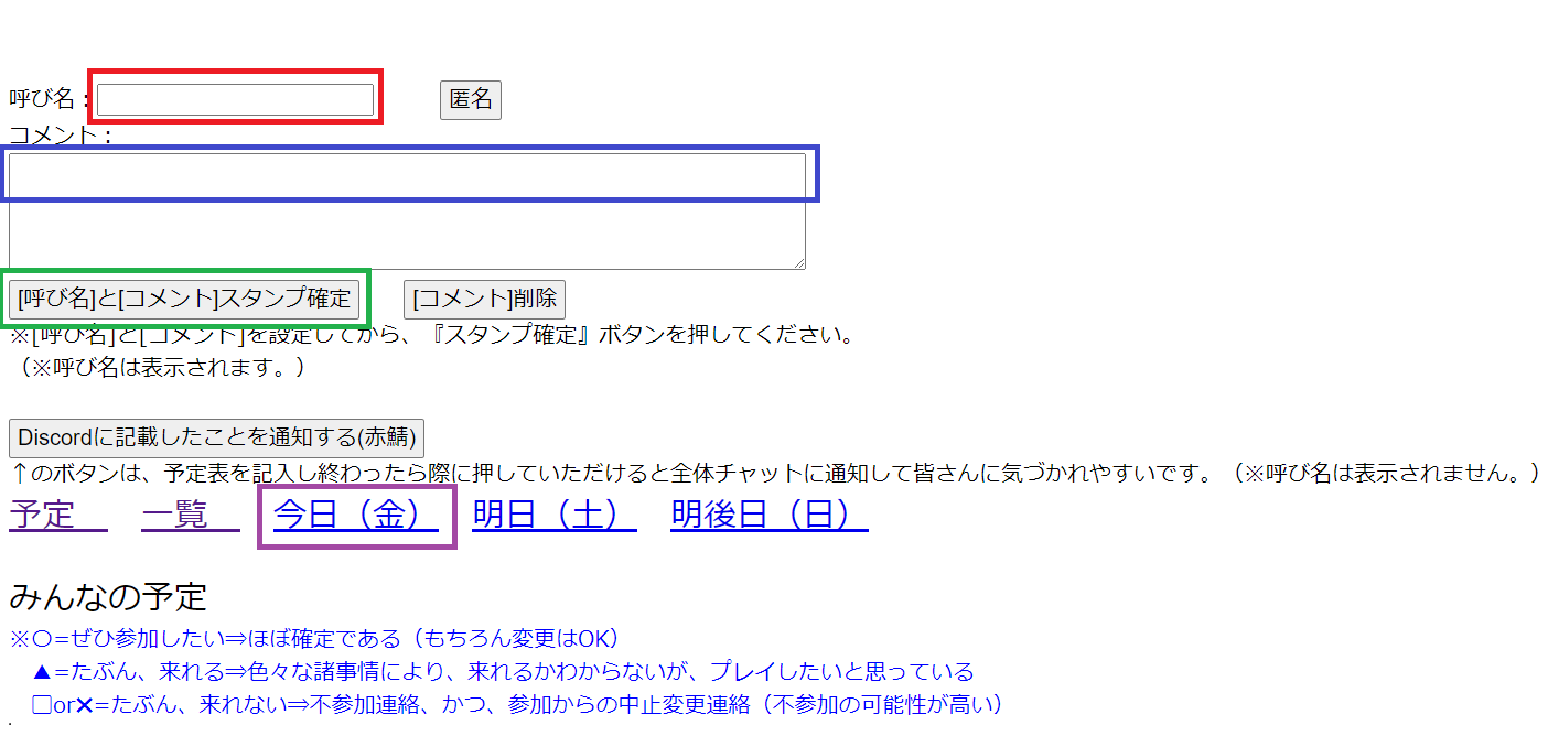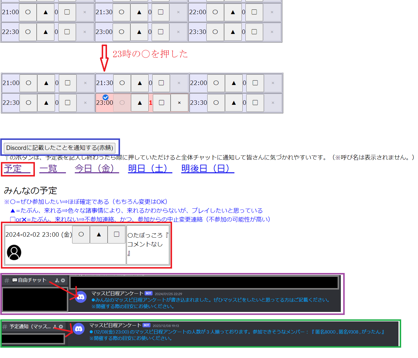 ◇2.画面の上部に見える青枠のDiscordに記載したことを通知する(赤鯖)のボタンを押したら、特に名前は出さずに、予定を書いたことを伝えることができます。紫枠のようなチャットが #自由チャットで流れます。