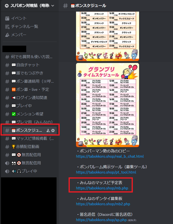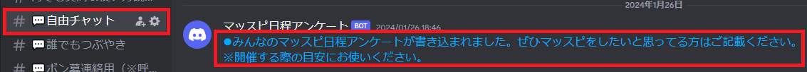 ◇3.アンケートをみんなが書いてくれて、3人以上に達した場合、 #予定通知(マッスピ)に緑枠のようなログが流れます。(そのログが流れたら、部屋が立つことかなり多くなります。)